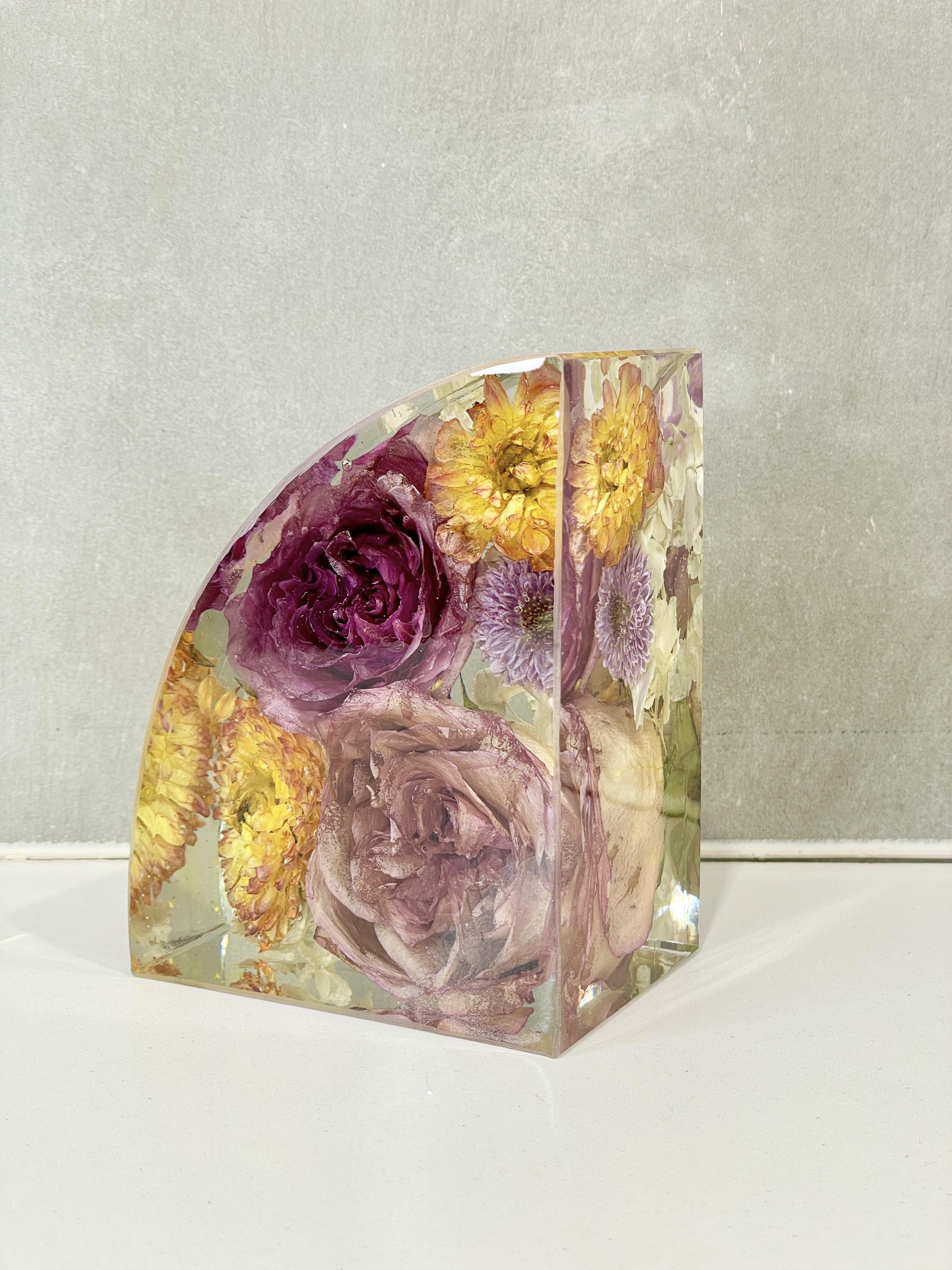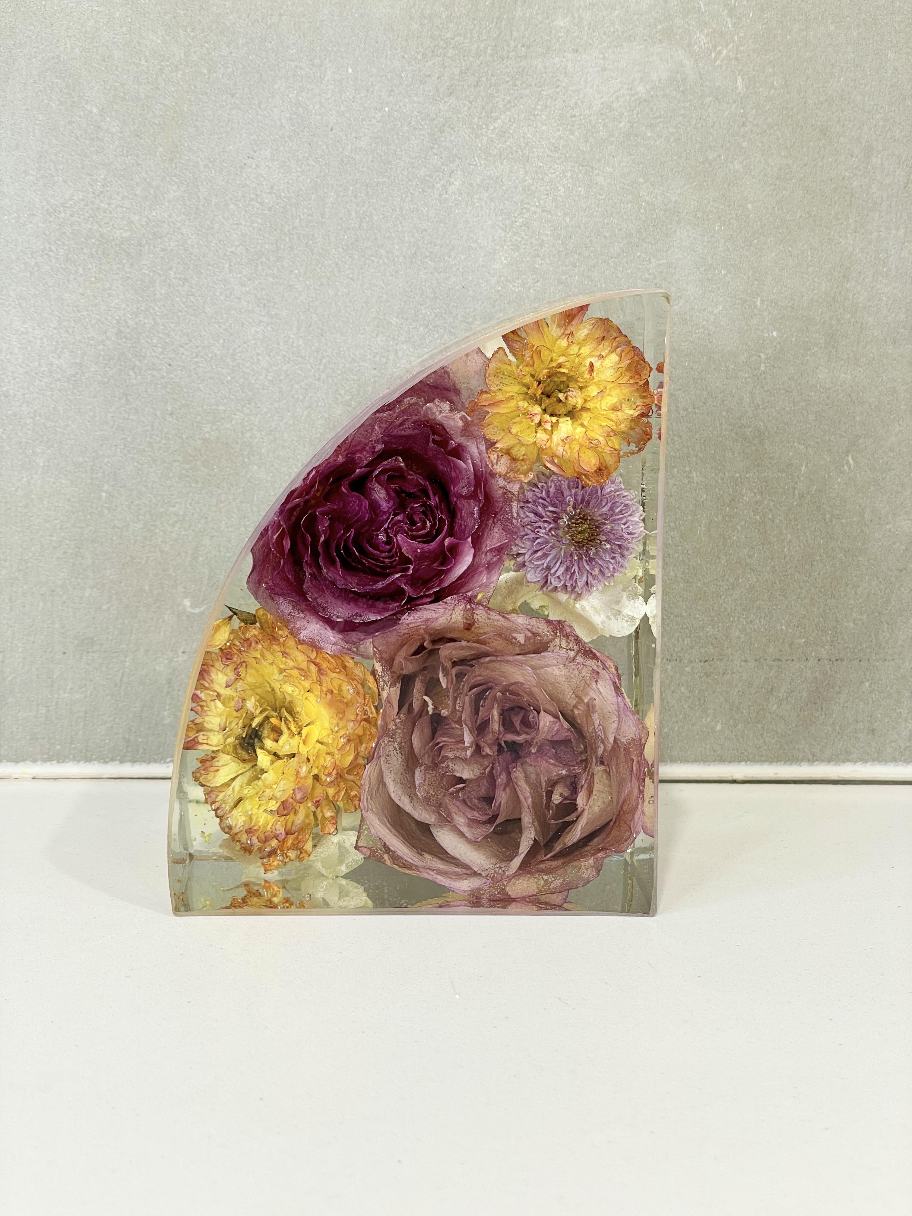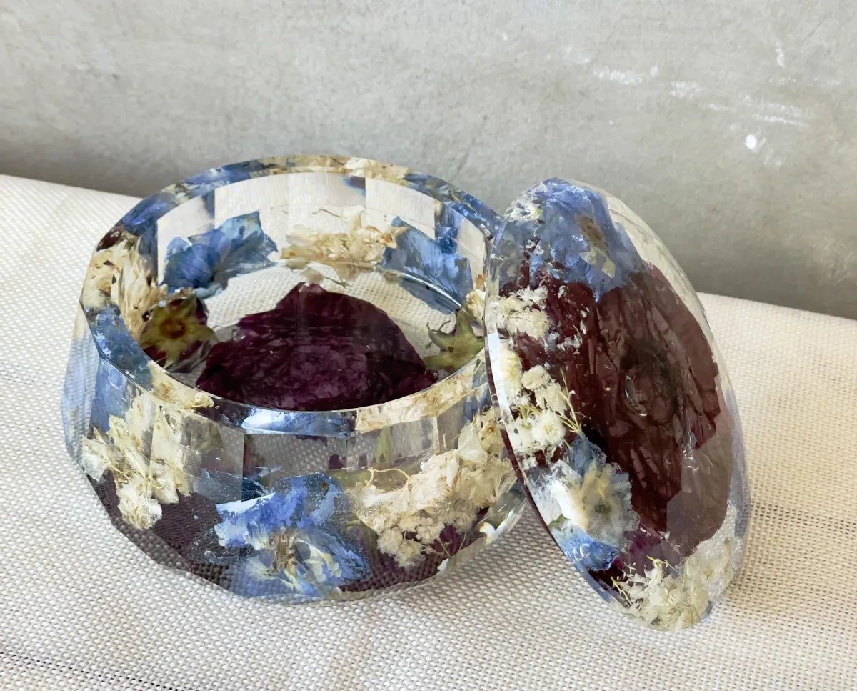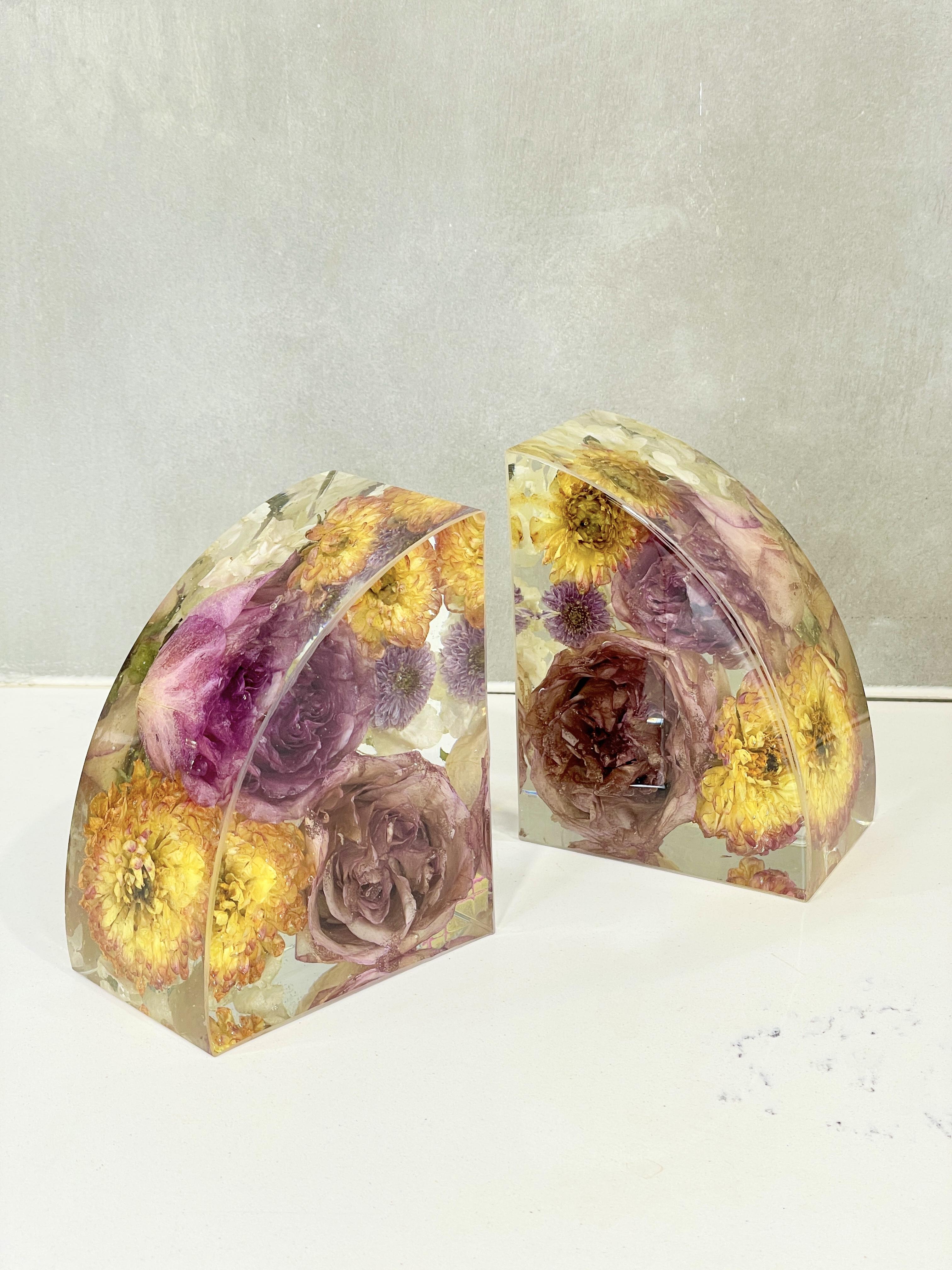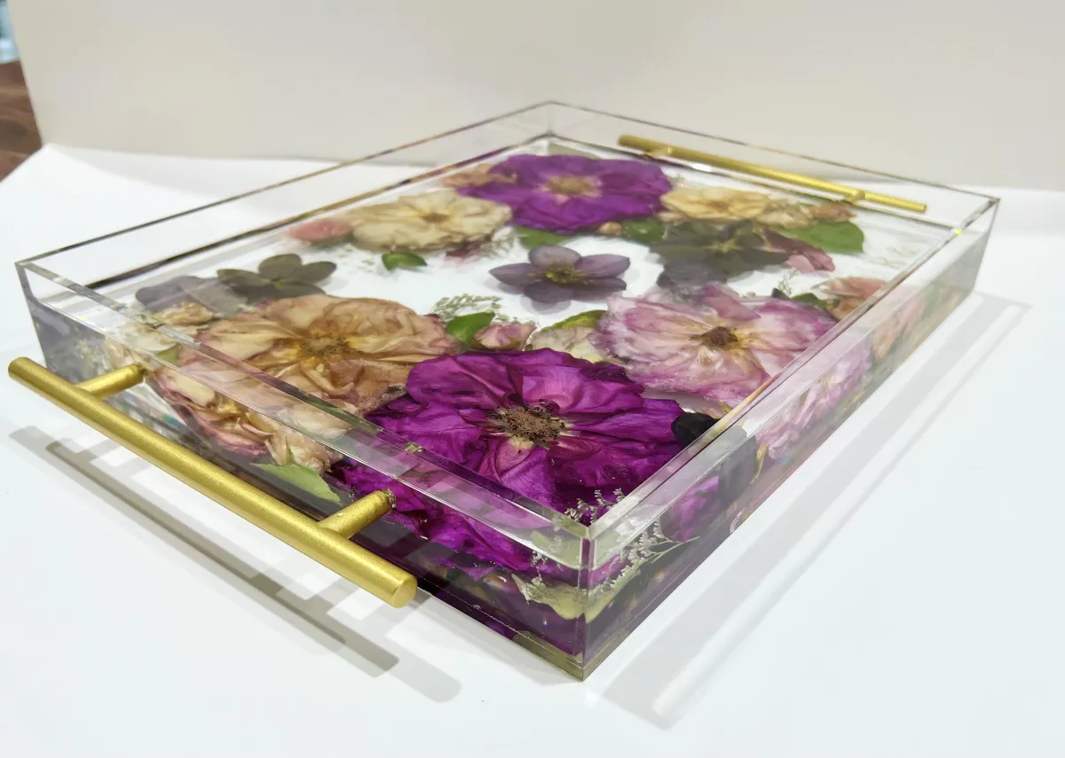 Preservation is a handmade process using real flowers and resin. Each piece is created over many days and poured in layers, allowing time to properly cure.