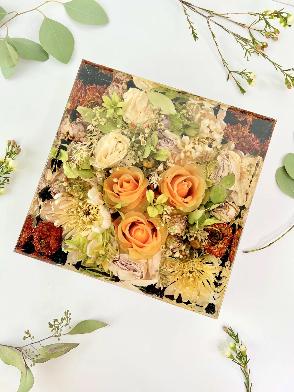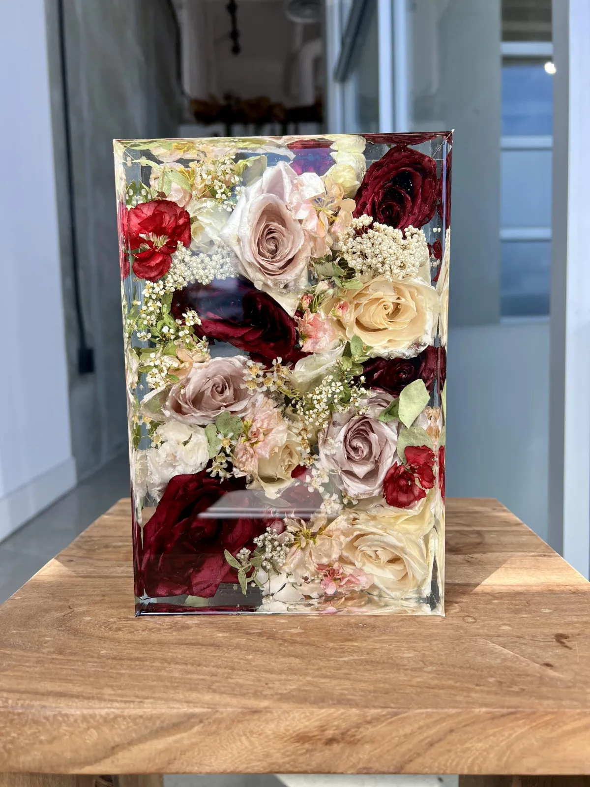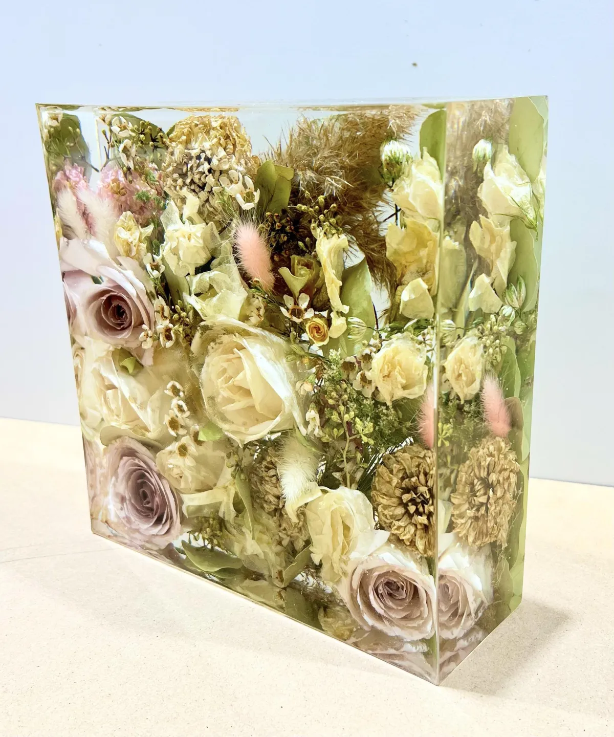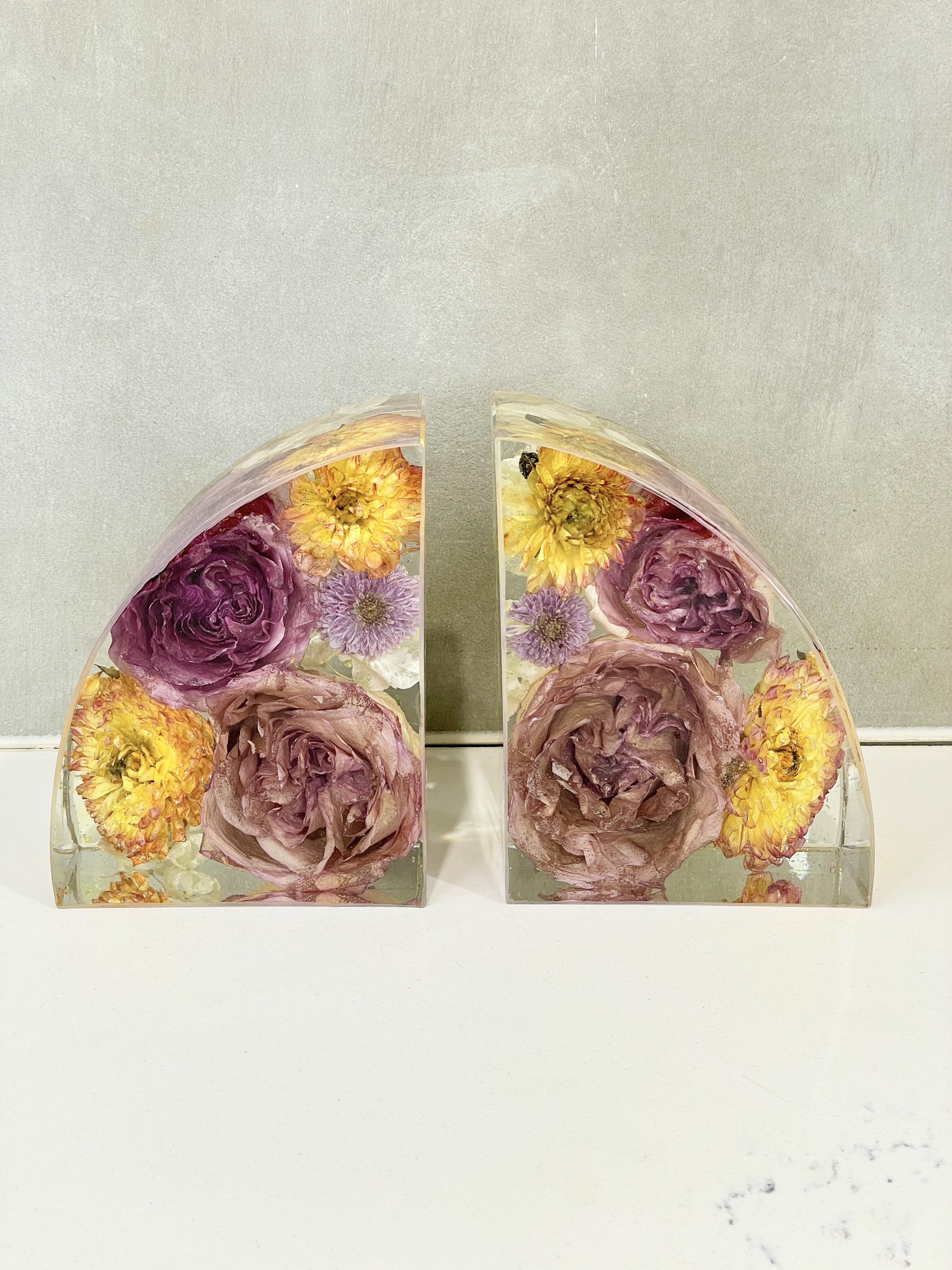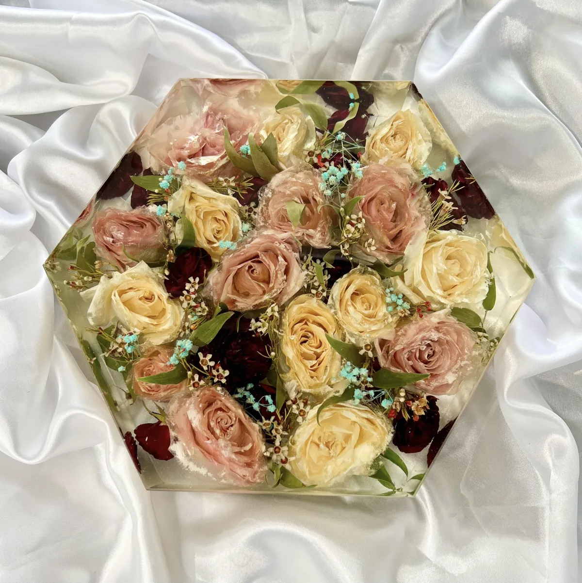 Preservation is a handmade process using real flowers and resin. Each piece is created over many days and poured in layers, allowing time to properly cure.