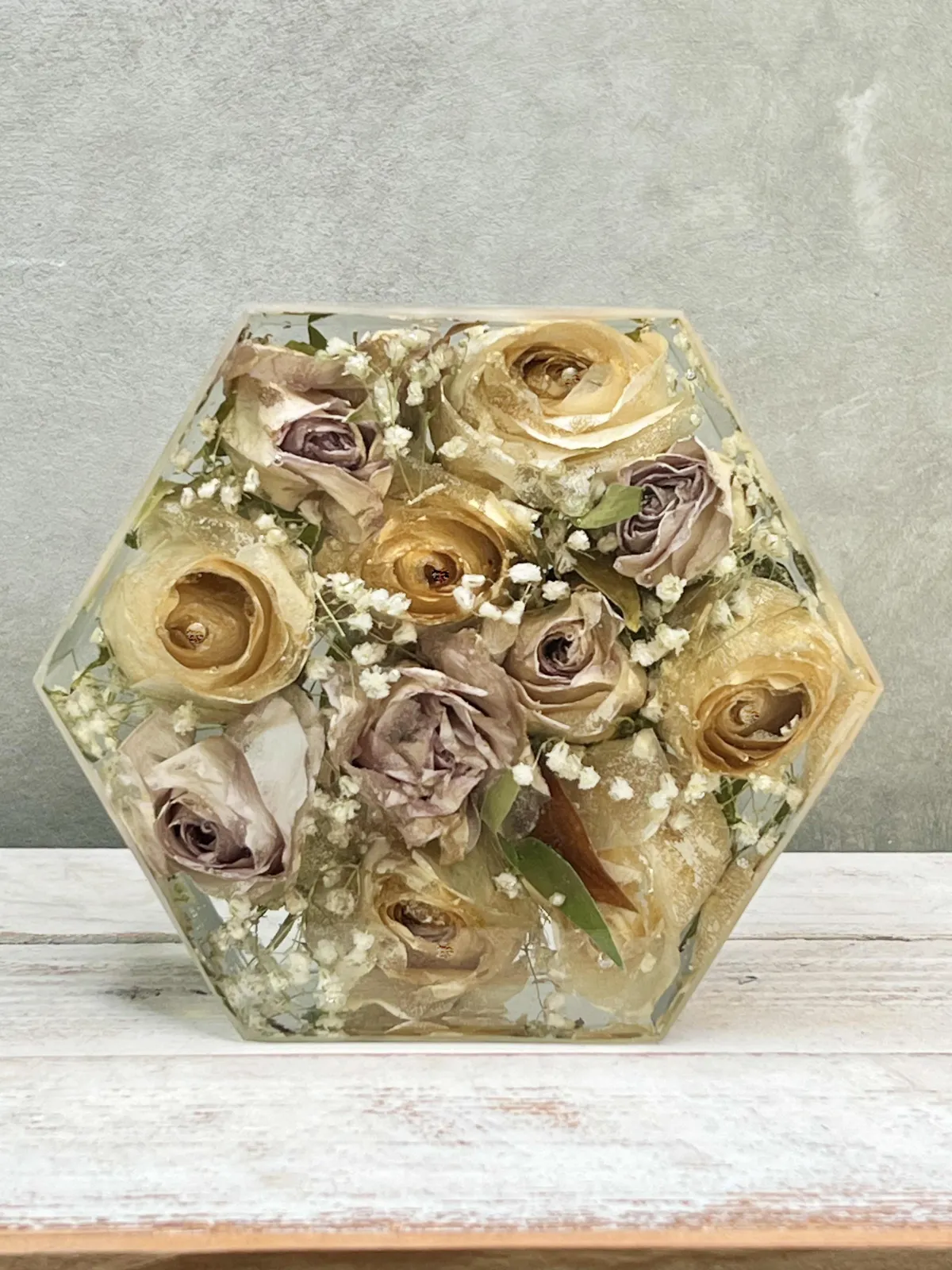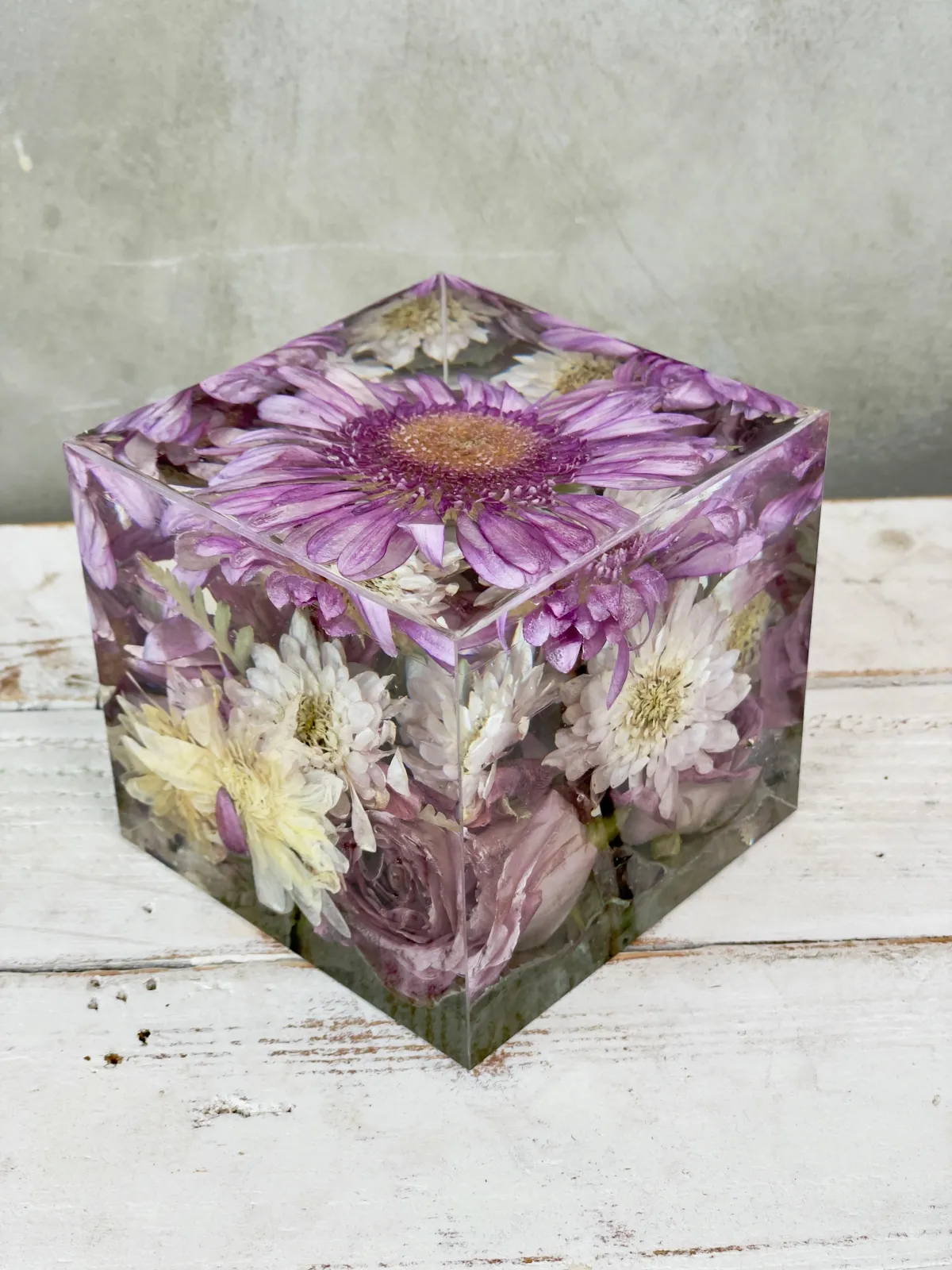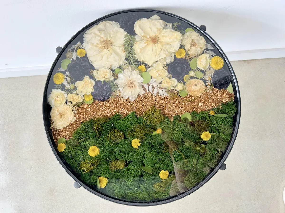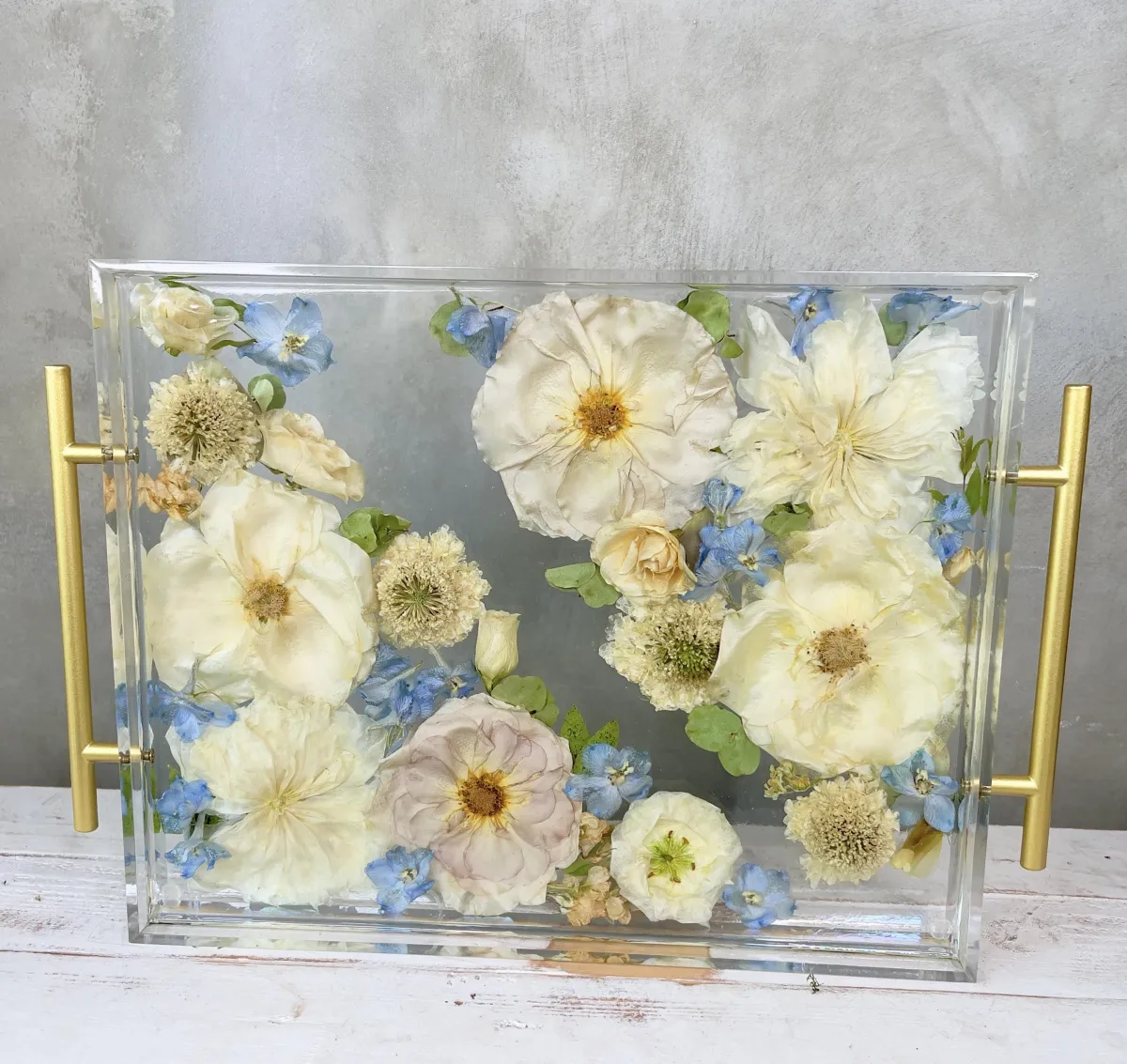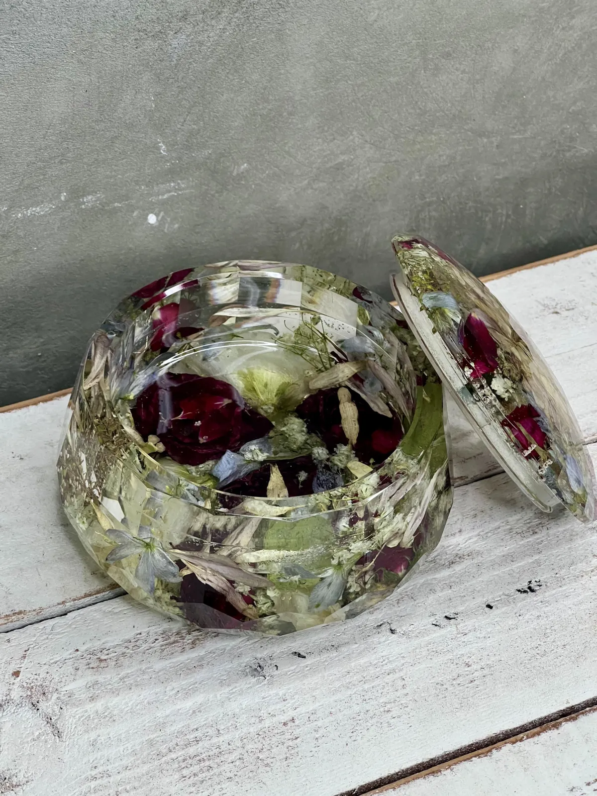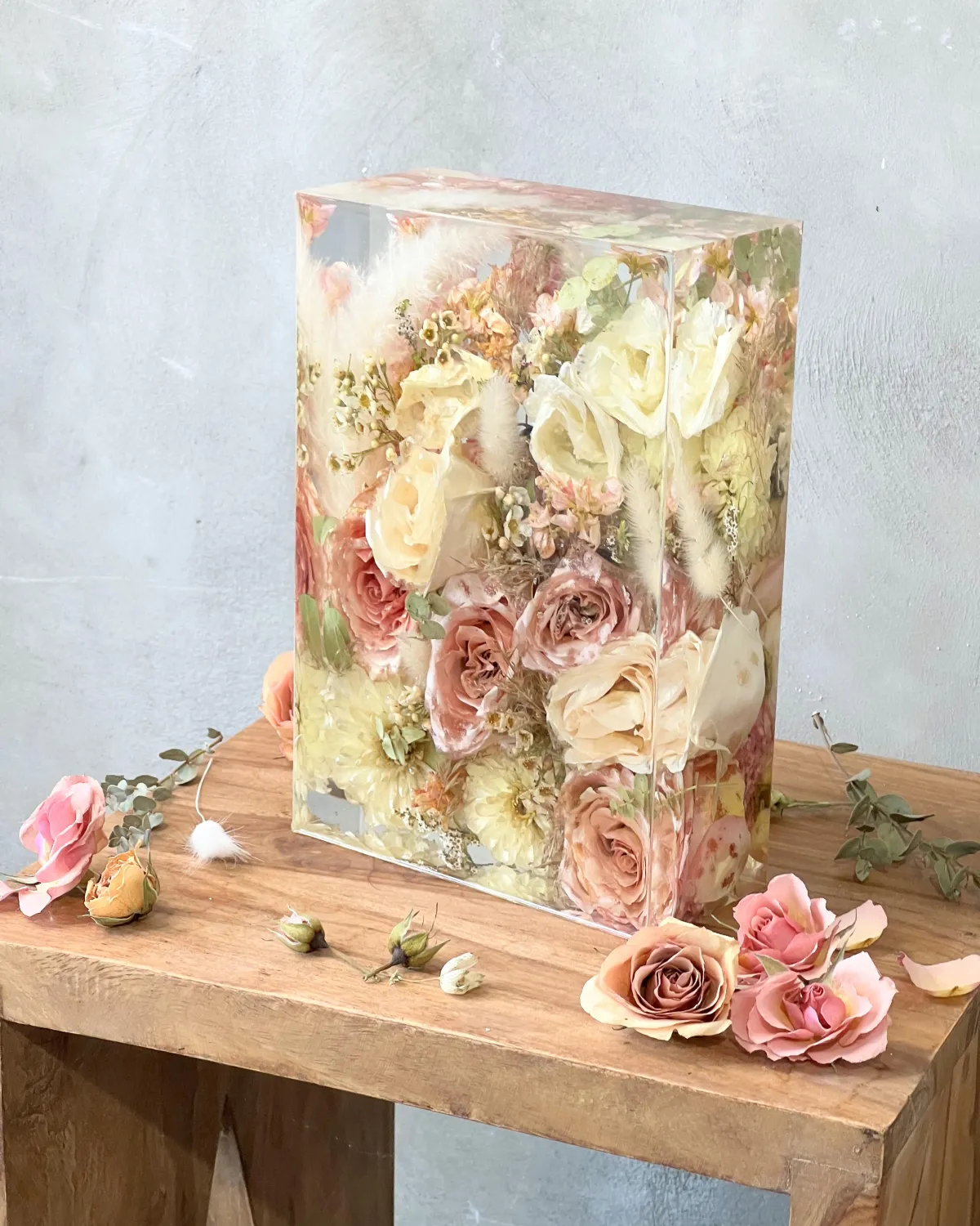Preservation is a handmade process using real flowers and resin. Each piece is created over many days and poured in layers, allowing time to properly cure.