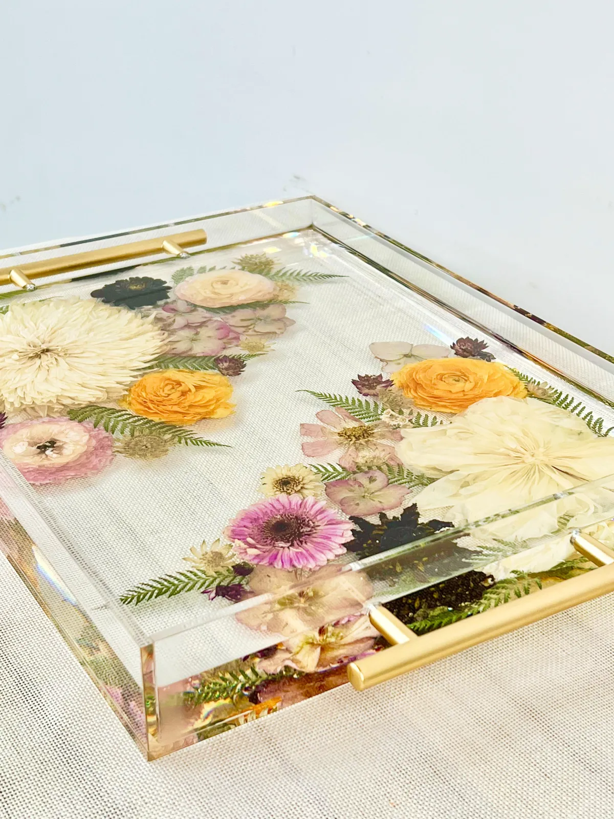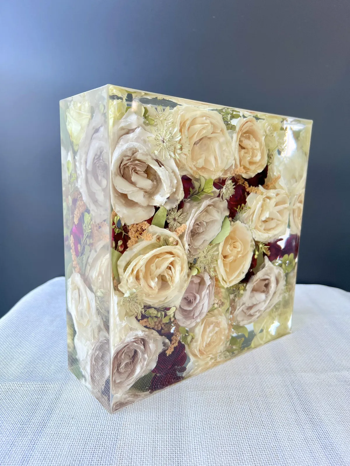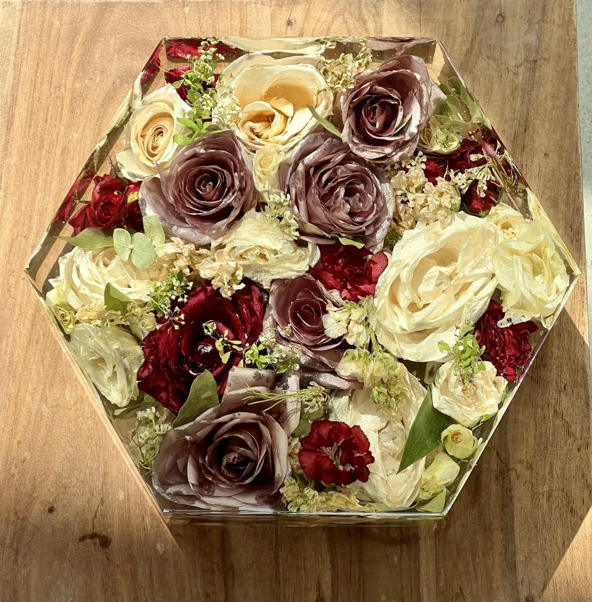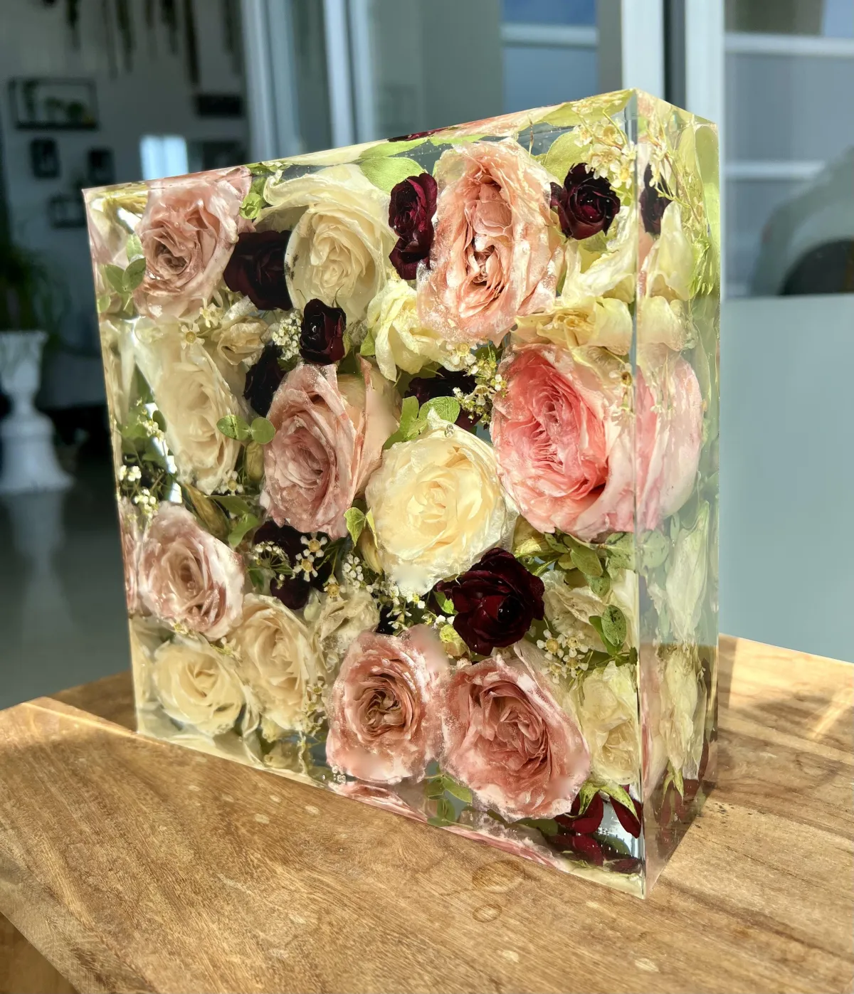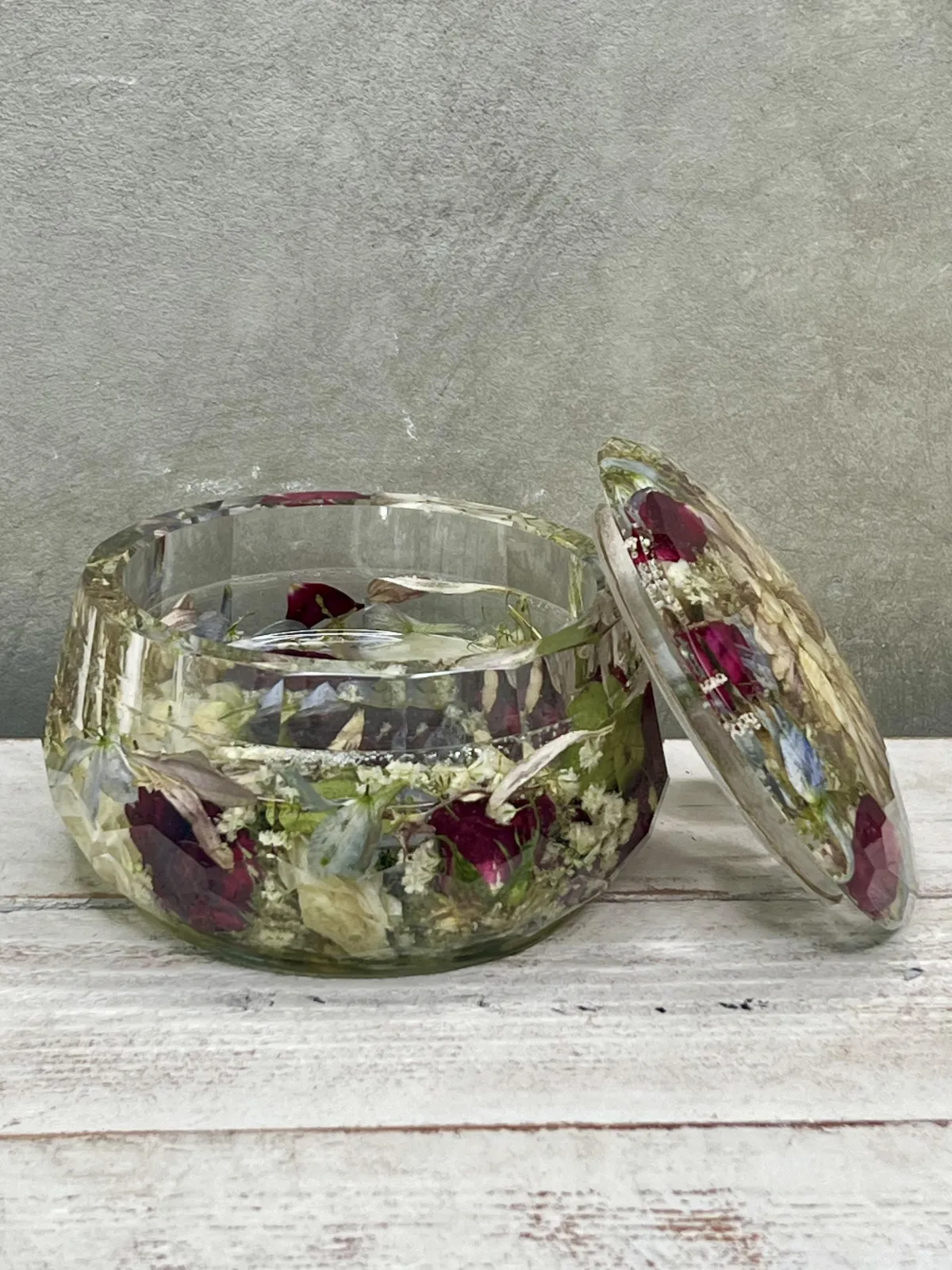 Preservation is a handmade process using real flowers and resin. Each piece is created over many days and poured in layers, allowing time to properly cure.