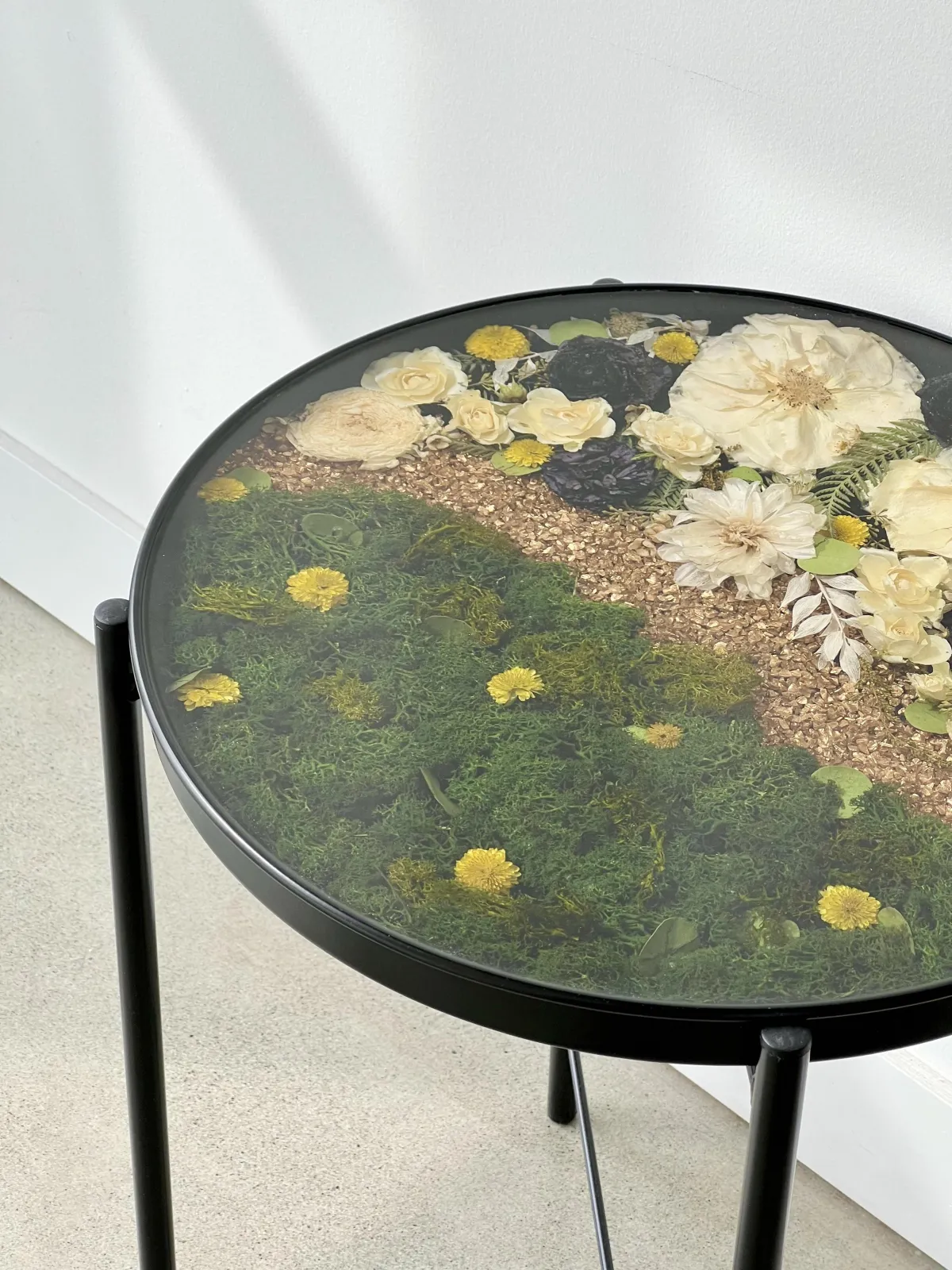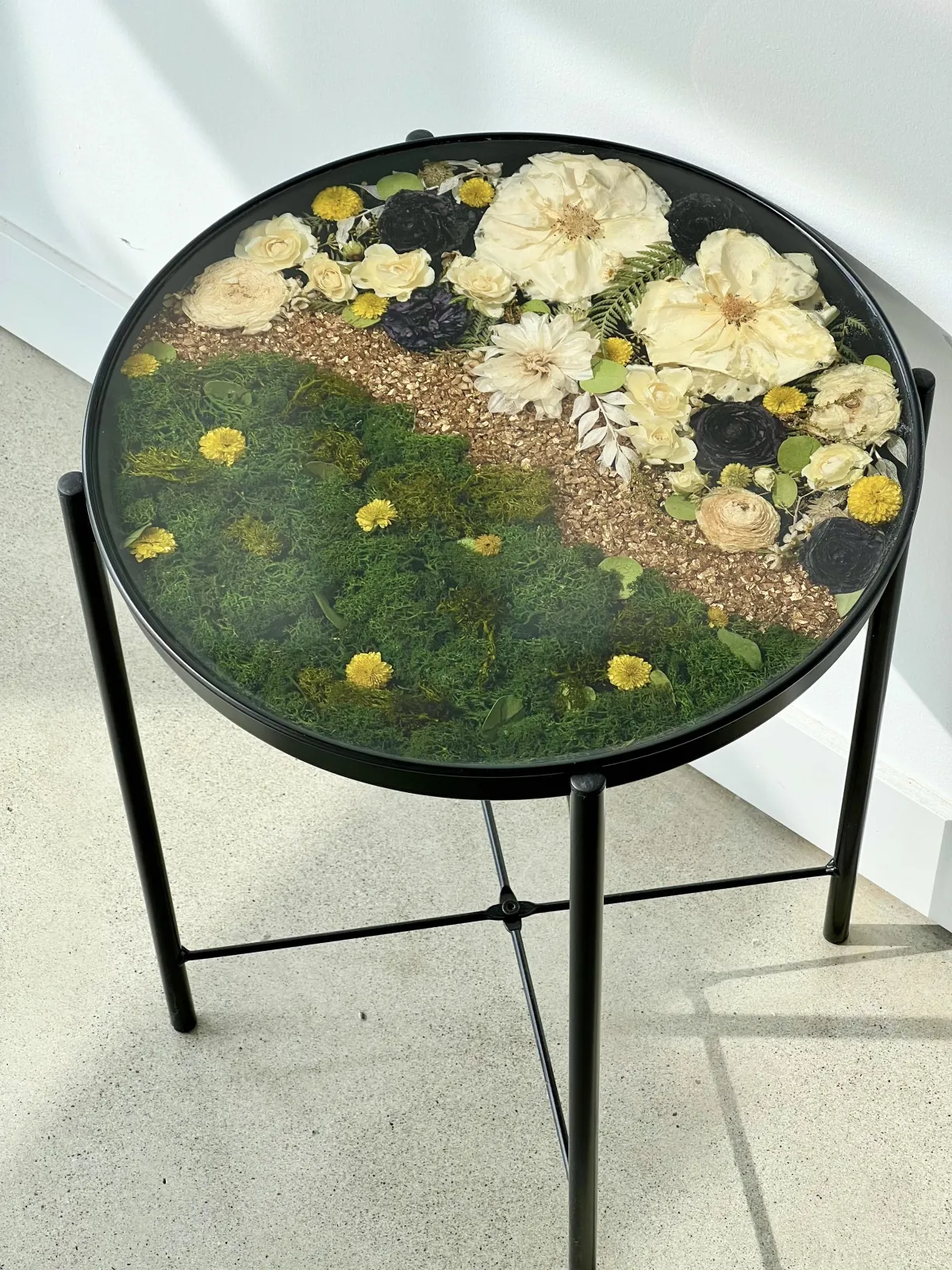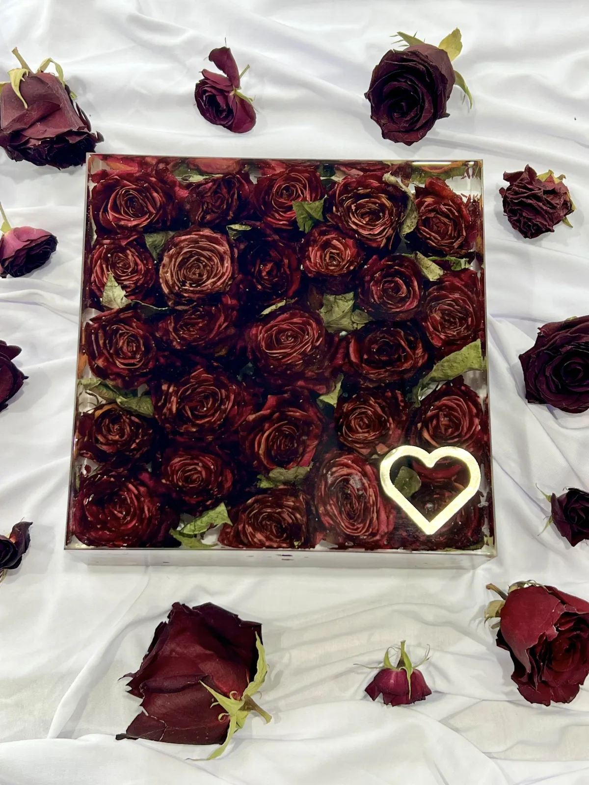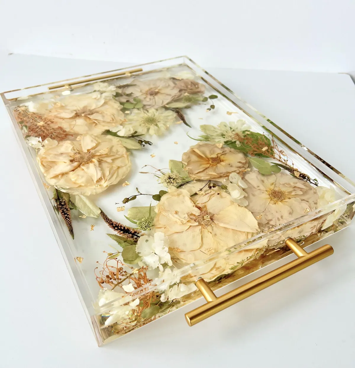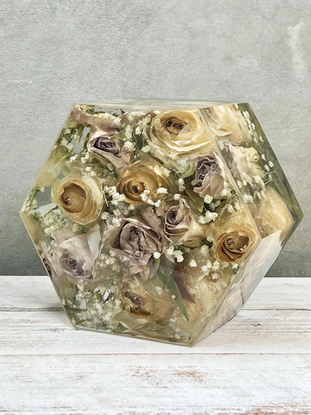 Preservation is a handmade process using real flowers and resin. Each piece is created over many days and poured in layers, allowing time to properly cure.