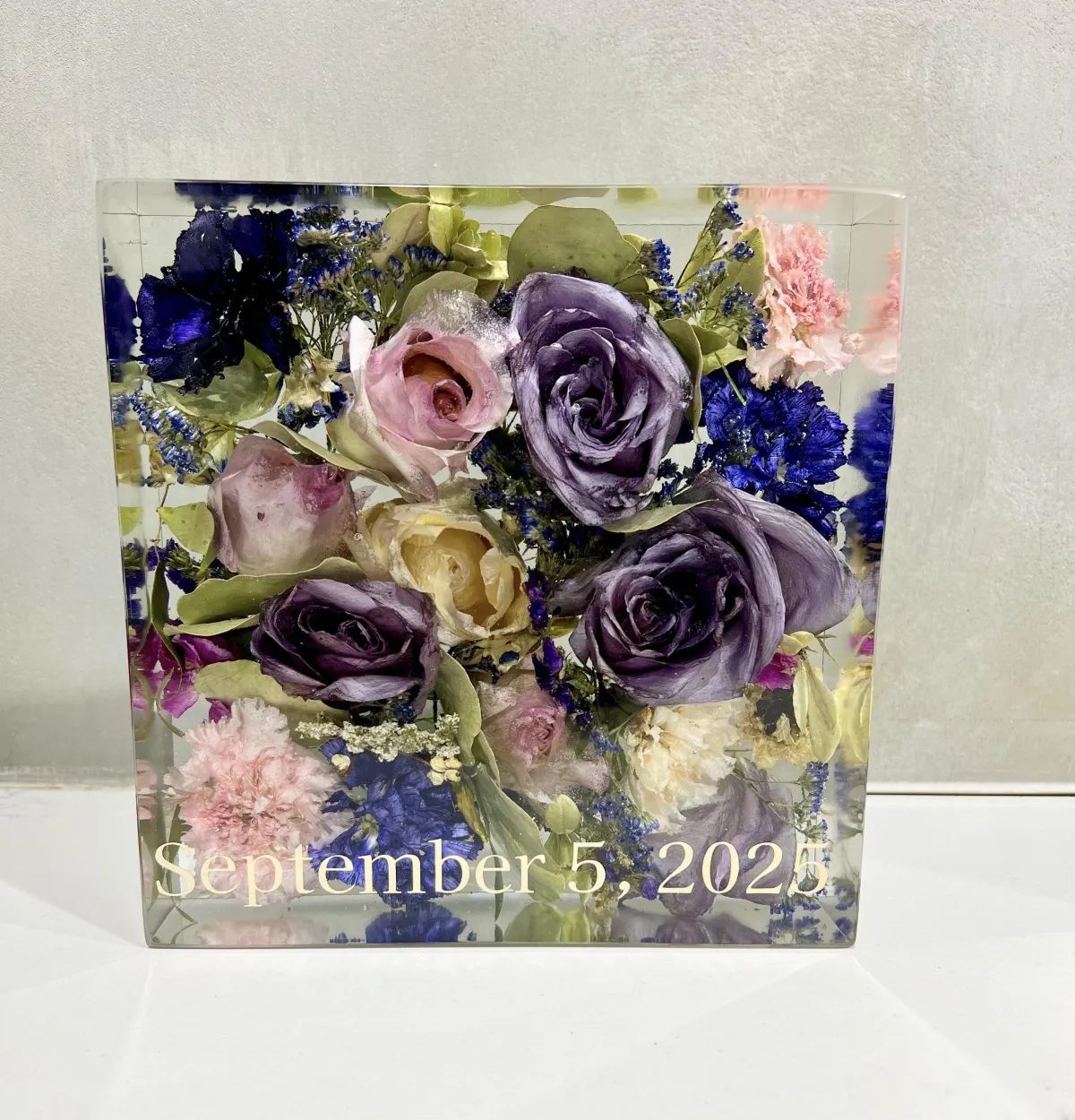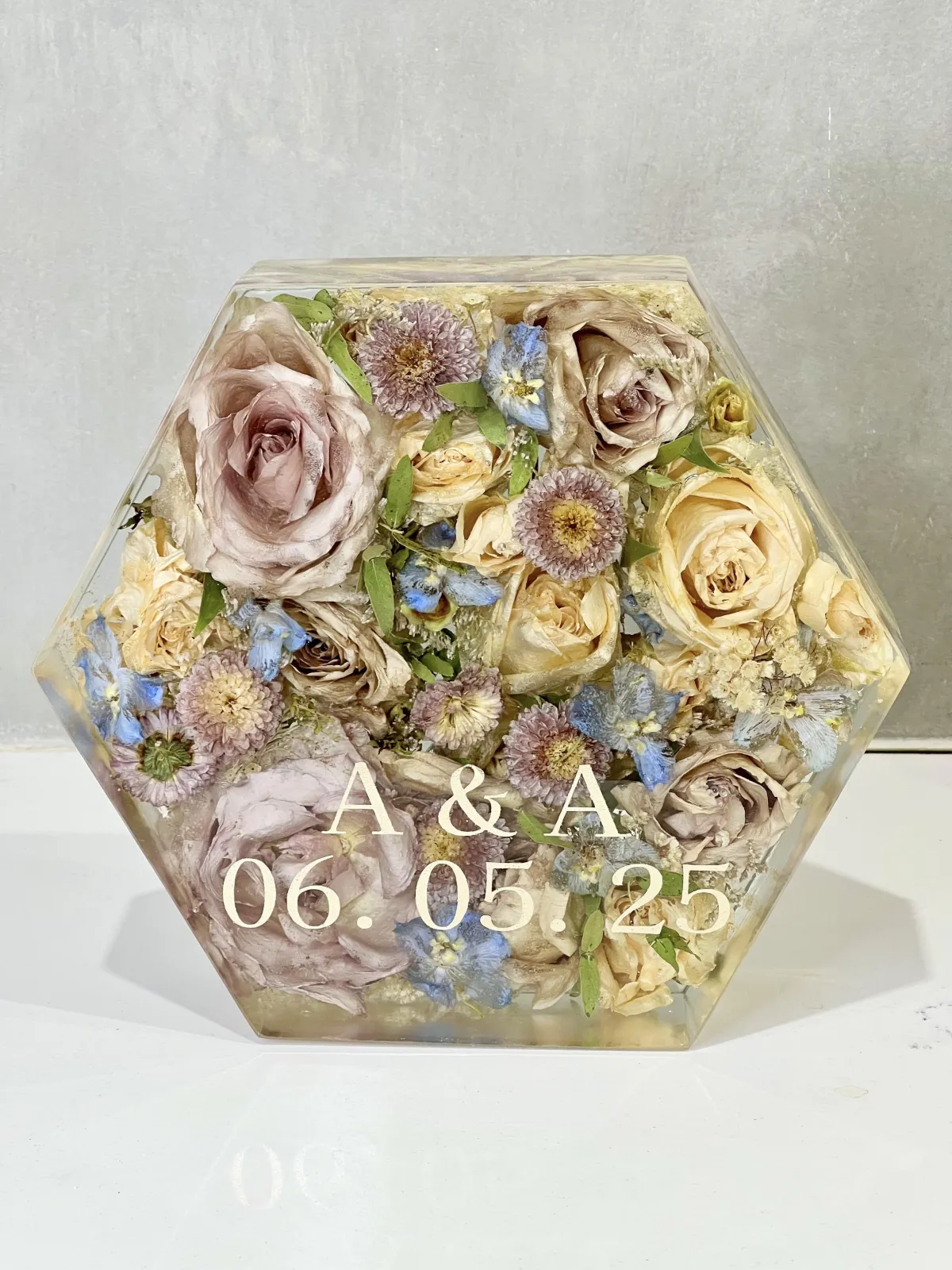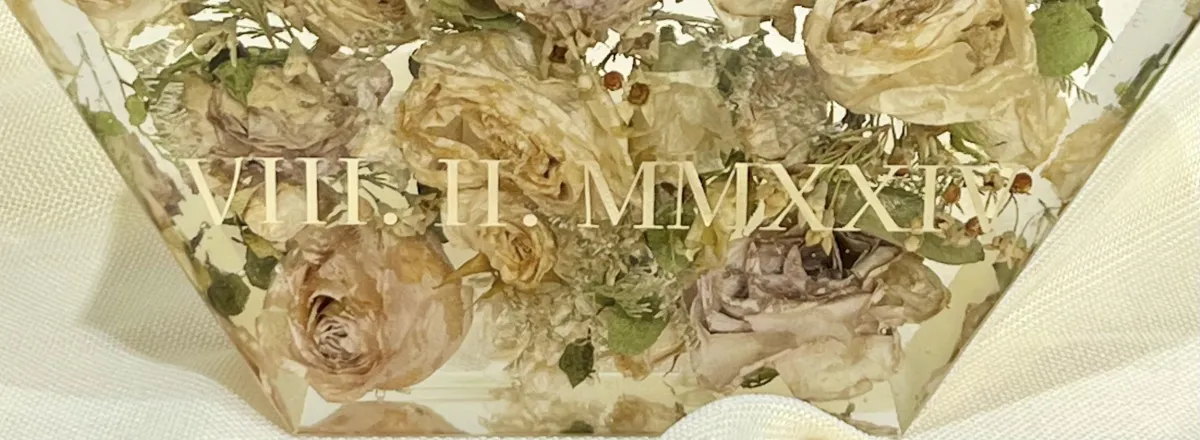 Each piece begins with a real moment — a wedding, farewell, or celebration. Using your actual flowers, we carefully preserve them in crystal-clear resin, transforming fleeting blooms into lasting keepsakes.