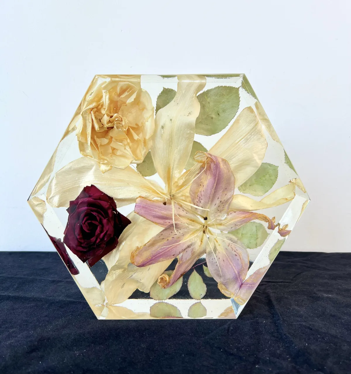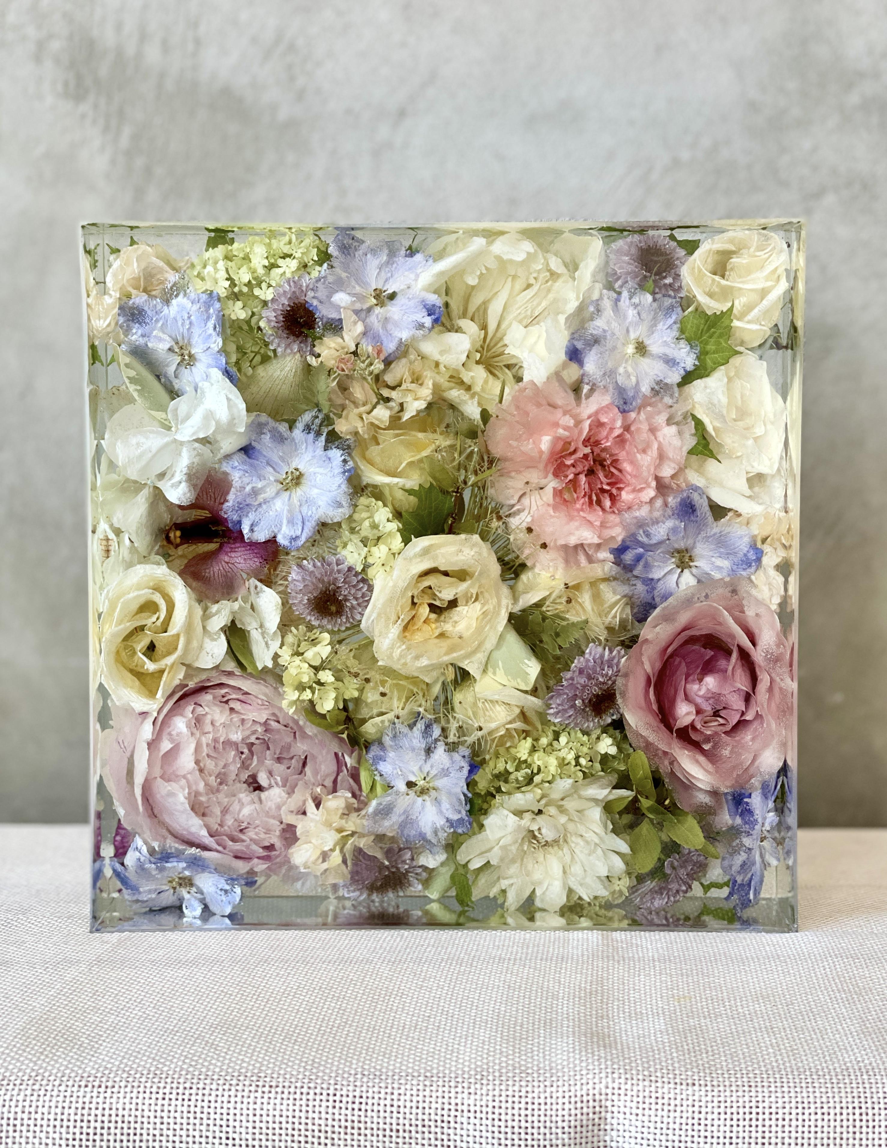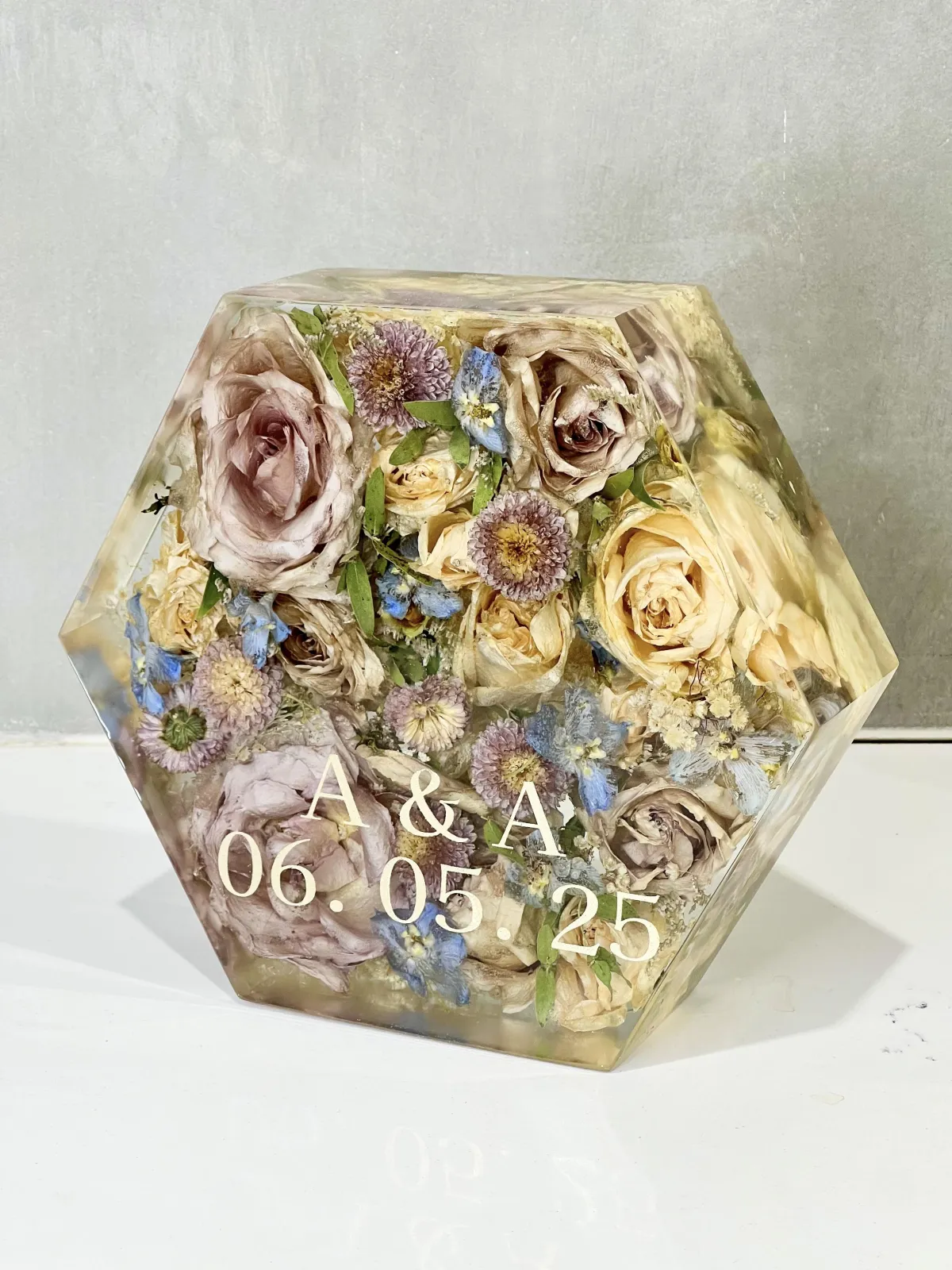 Each piece begins with a real moment — a wedding, farewell, or celebration. Using your actual flowers, we carefully preserve them in crystal-clear resin, transforming fleeting blooms into lasting keepsakes.