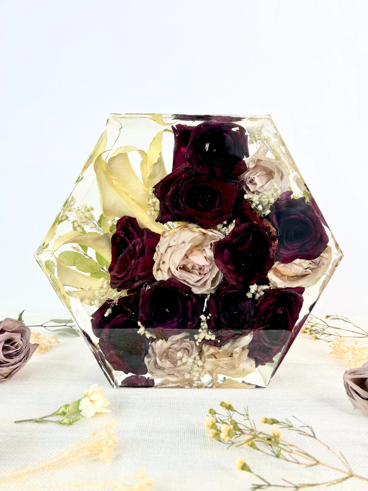 🌸 Some flowers may develop translucent areas or natural “bruising” when cast in resin