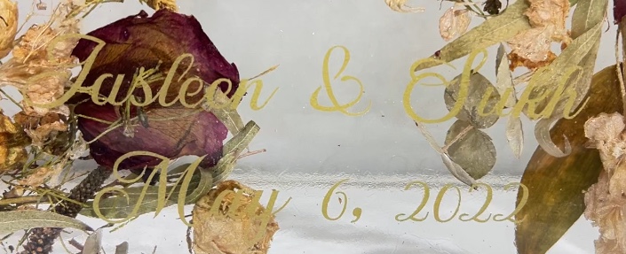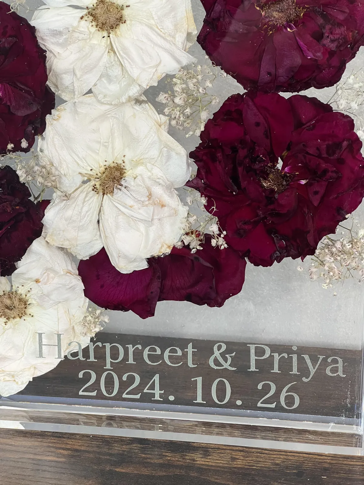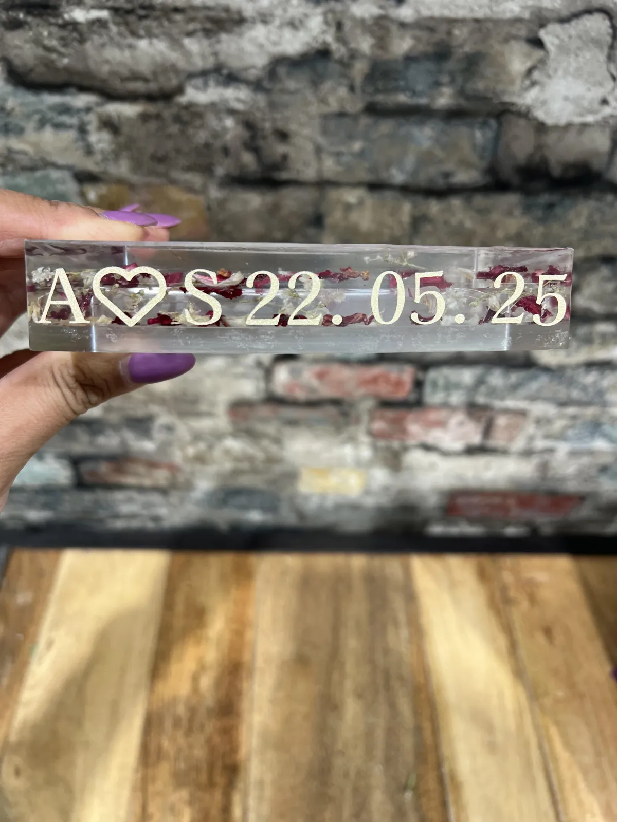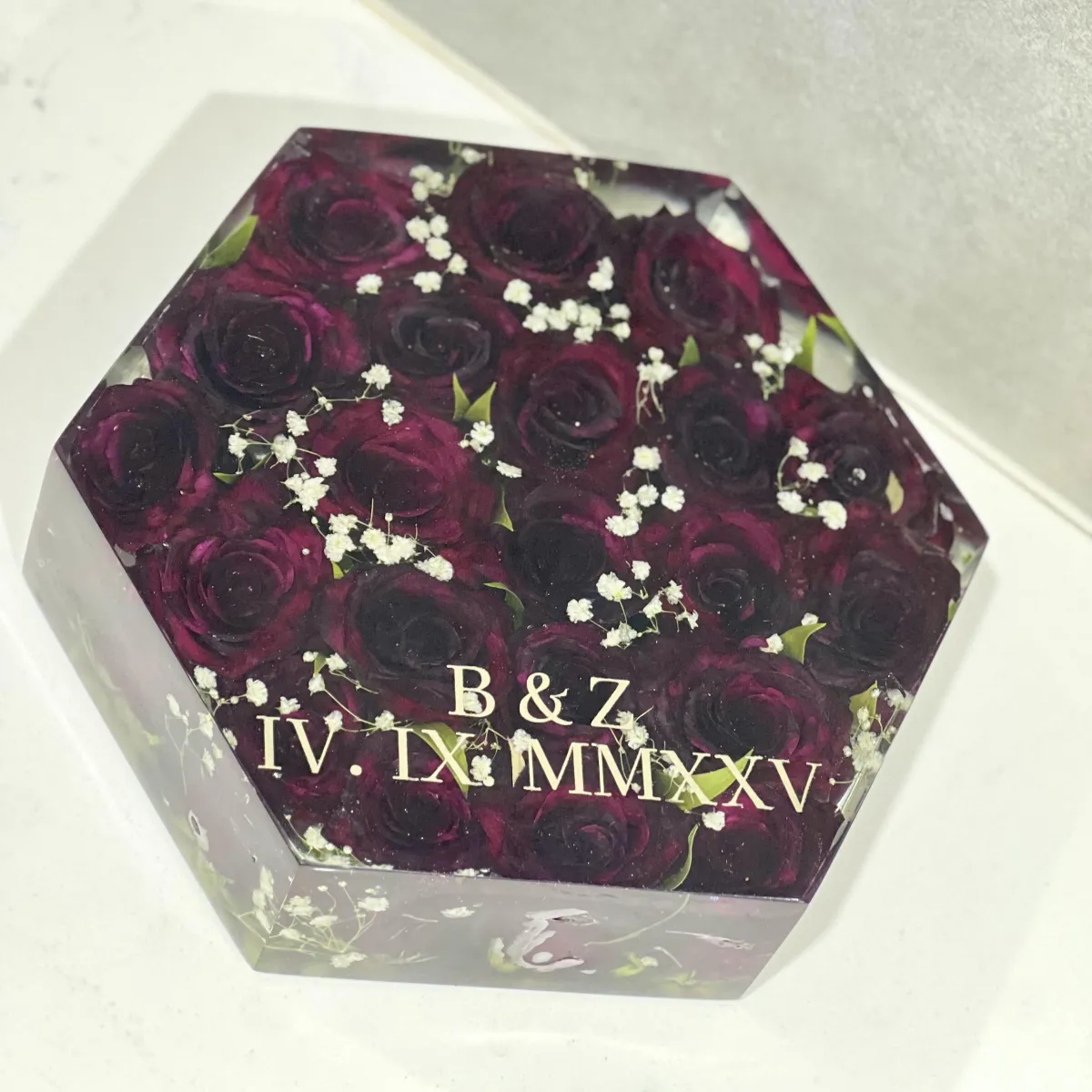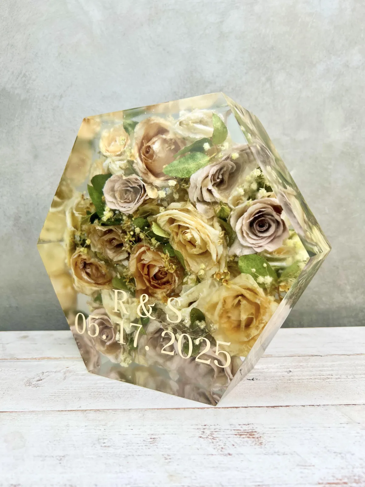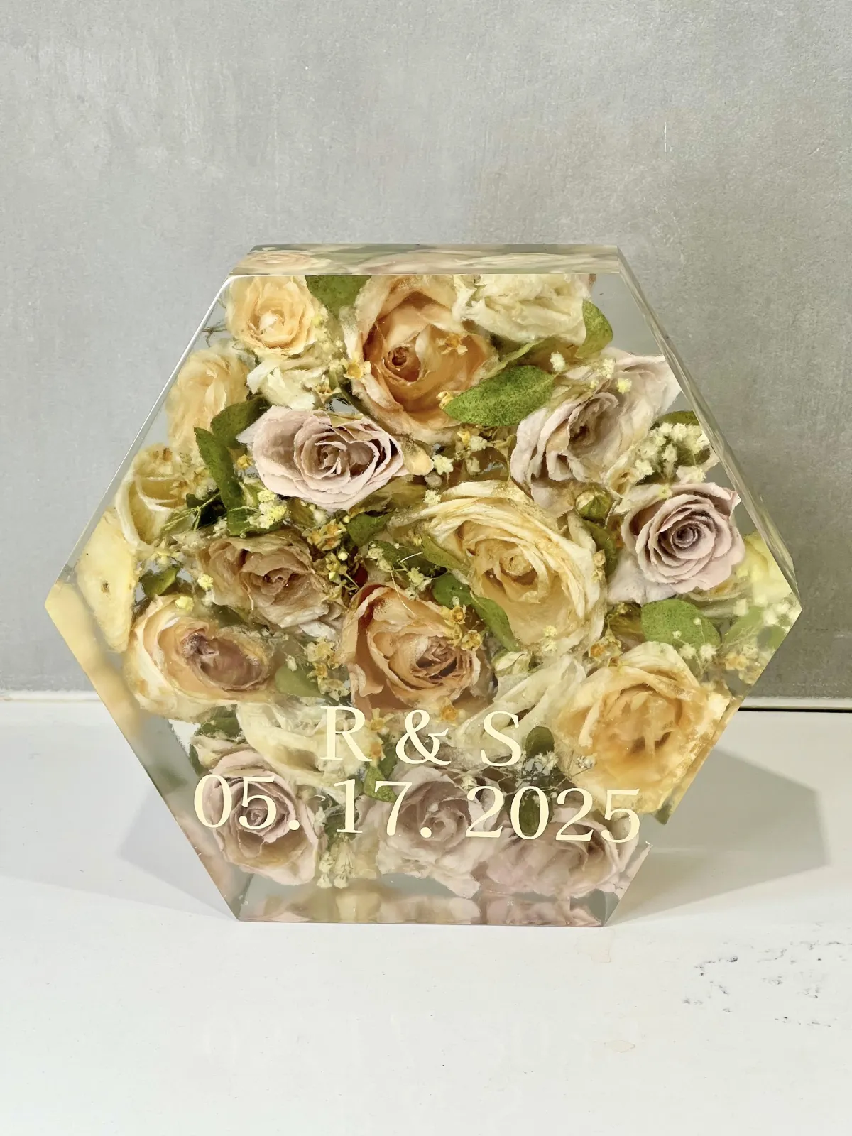 If personalization is being added inside a resin piece, any paper items (such as invitations or photos) must be laminated to protect them from the heat generated during the resin curing process. We will guide you on what is suitable and how to prepare these items.
