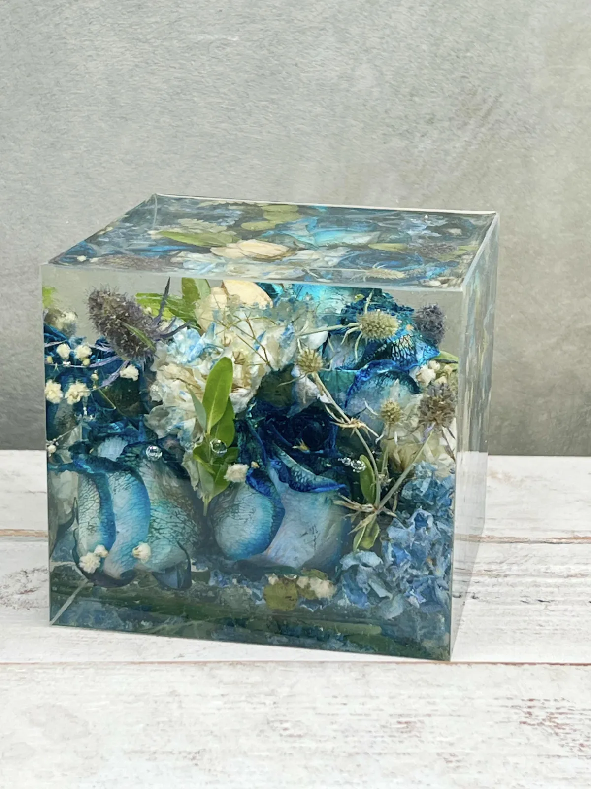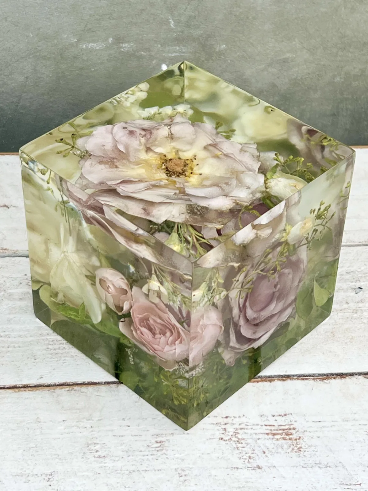 Because of the nature of resin and natural materials, small bubbles, natural inclusions, colour shifts, and visible pour lines may occur, particularly on block-style pieces. These characteristics are normal and part of handcrafted resin preservation.