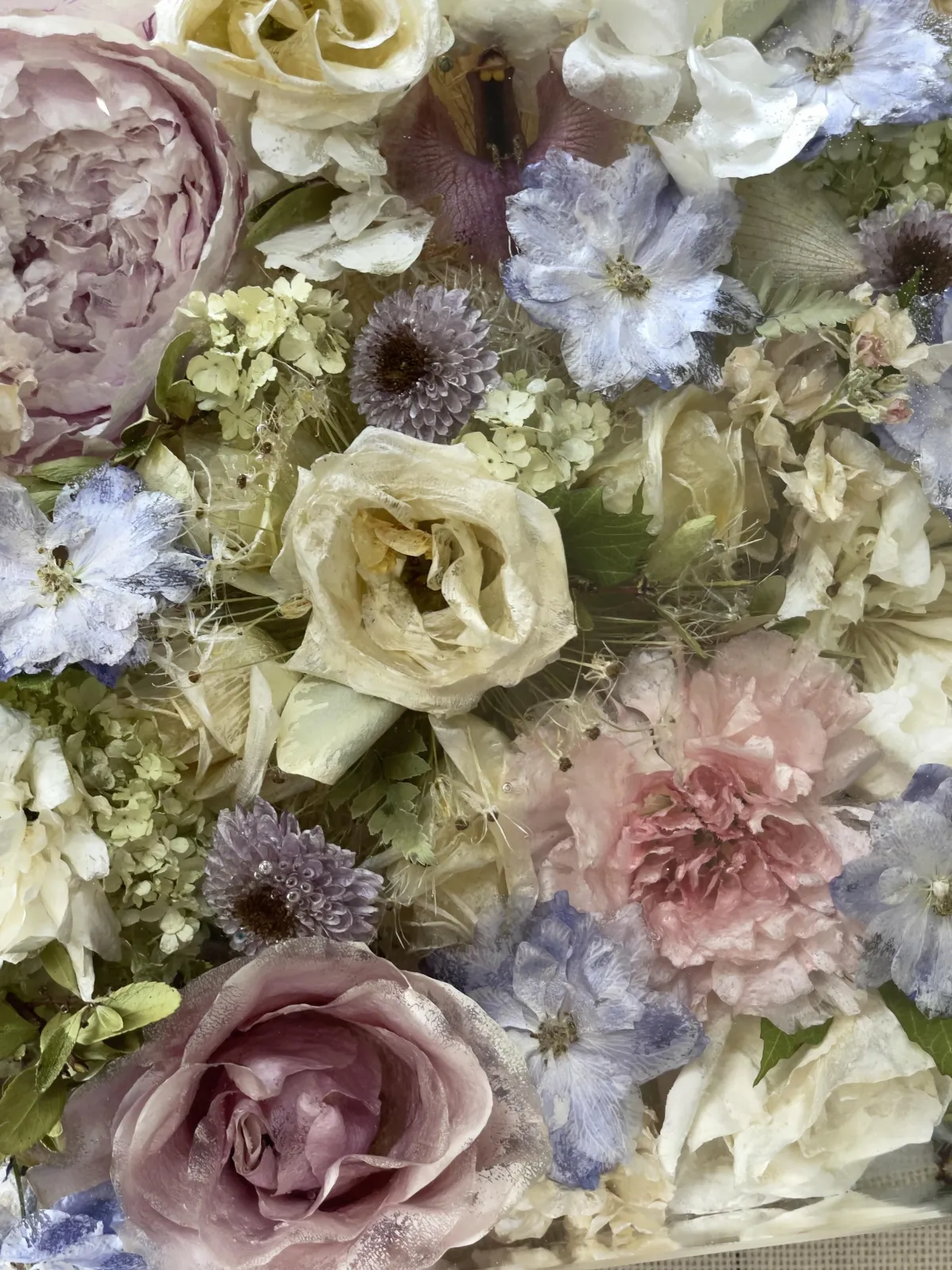 Fresh flowers are carefully dried over 4–6 weeks before resin casting begins.